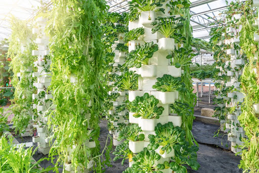 Vertical farms can take many different shapes and sizes, but they operate the same at their cores. First of all, in vertical farm crops, they aren't grown horizontally (which you may have gleaned from the name), but in a stacked or tower formation. In tower-style vertical farming, plants are grown upward, intertwining into the lattice or supporting structure. In the stacked method, the vertical 'stacks' are basically growing trays, supported by shelves on top of one another.